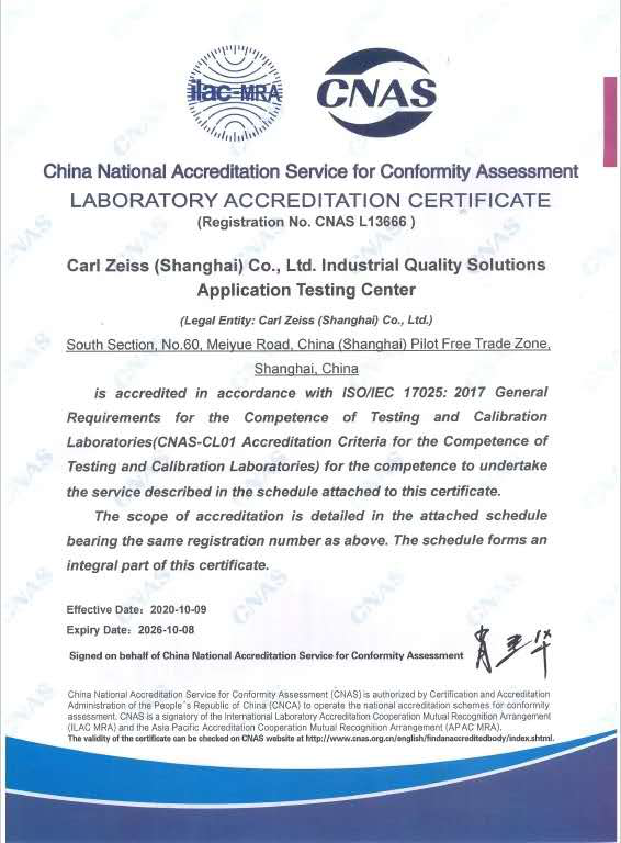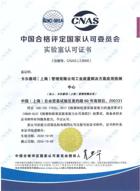 近日,卡尔七台河蔡司(上海)管理有限公司工业质量解决方案应用检测中心经过中国合格评定国家认可委员会(CNAS)严格的现场评审和后续考察,正式通过了最终审评并获得实验室国家认可证书。至此,标志着蔡司应用检测中心具有了国家及国际认可的管理水平和校准能力。